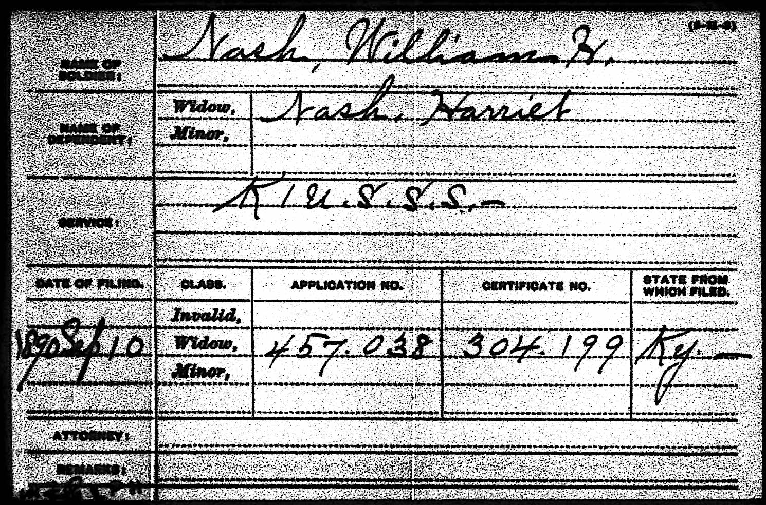 Note the name on the gravestone of William H. Nash’s wife: Harriet. And we know that the widow of the William H. Nash who served in the United States Sharpshooters was named Harriet, as is shown on this pension index card: