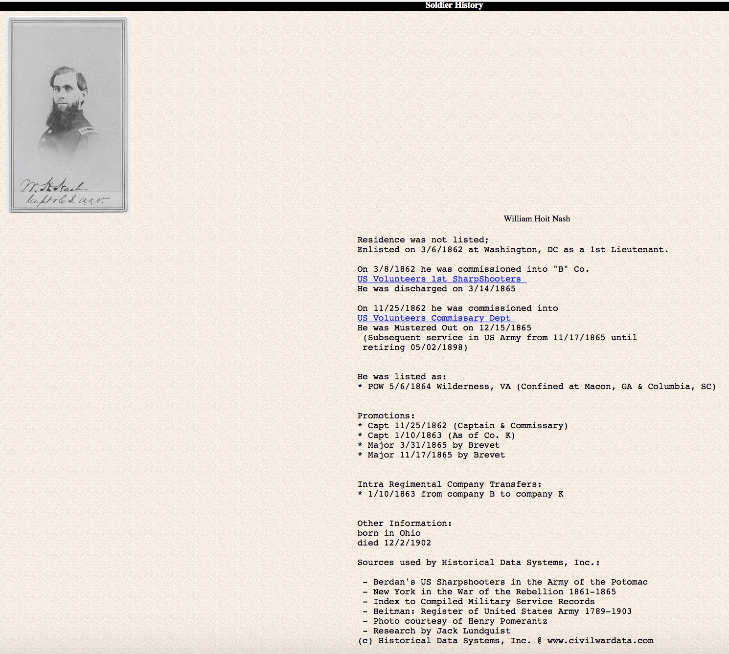 Having worked on 5,200 Civil War-related biographies for Green-Wood’s Civil War Project on an ongoing basis for 16 years now, I was intrigued by the details of William H. Nash’s military service in Kernan’s book. I was particularly interested in his service as an officer in the United States Sharpshooters, an elite regiment. However, when I attempted to confirm Kernan’s information about Nash’s Civil War service, I ran into a problem. The best source for detailed information about the particulars of Civil War army service is the American Civil War Research Database, to which I have been a subscriber for 16 years. Here’s what I found when I searched for the officer by the name of William H. Nash who served in Berdan’s Sharpshooters: