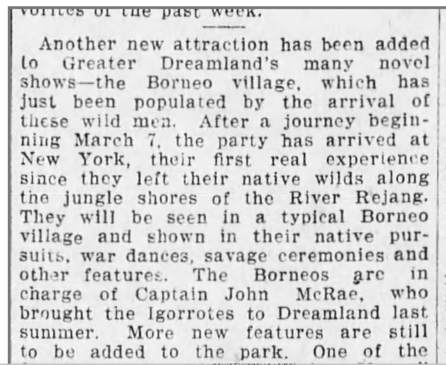 What do we know about the Borneo Village at Dreamland? On May 29, 1910, the Brooklyn Daily Eagle reported on Coney Island attractions for the upcoming summer season. Don Fulano, “a revelation in equine intelligence,” who “reads, writes, spells,” and solves math problems, as well as “laughs at funny stories when told to him by his press agent” (who doesn’t?), would be exhibited for the coming season. And, the article continued, “In a few more days Dreamland will also add to its attractions a Borneo village, with thirty native warriors, who were brought over here under the direction of Caption John McRae.” McRae, in another newspaper article, is described as a military veteran “who brought the first head hunters to America” (apparently in an earlier excursion).