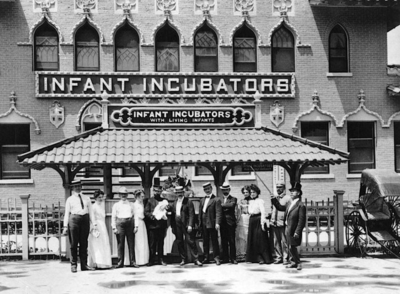 In the early 20th century, Coney Island was a place of mass entertainment–much of it very low brow. There were rides of all descriptions, many of which would never be allowed to operate today because of safety concerns. And there were entertainments that many would find so offensive today that they would never see the light of day. Imagine a Lilliputian Village, which opened in Coney Island in 1904, inhabited by small people recruited from circuses and freak shows. Or how about the Human Roulette Wheel, a large rotating disc designed to push strangers against each other in forced intimacy? At Dreamland, in 1903, you could pay your money to visit Dr. Martin Couney’s Infant Incubators, advertised as “With Living Infants,” where premature babies in need of medical treatment in an incubator (not accepted medical practice back then, and still decades before neonatal treatment was offered in hospitals) were put on public display–surrounded by attendants dressed as nurses and doctors.