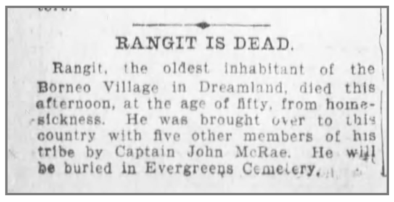 So who was Ronda Rangit? According to Green-Wood’s records, he was born in Borneo and was 53 years old at the time of his death; he died at Dreamland in Coney Island on July 2, 1910, from pneumonia. He was interred in lot 88 (one of the Freedom Lots), grave 70, on July 4, 1910. On July 3, 1910, just two months after the Borneo Village opened at Dreamland, and the day before his interment at Green-Wood, the Brooklyn Daily Eagle reported his death: