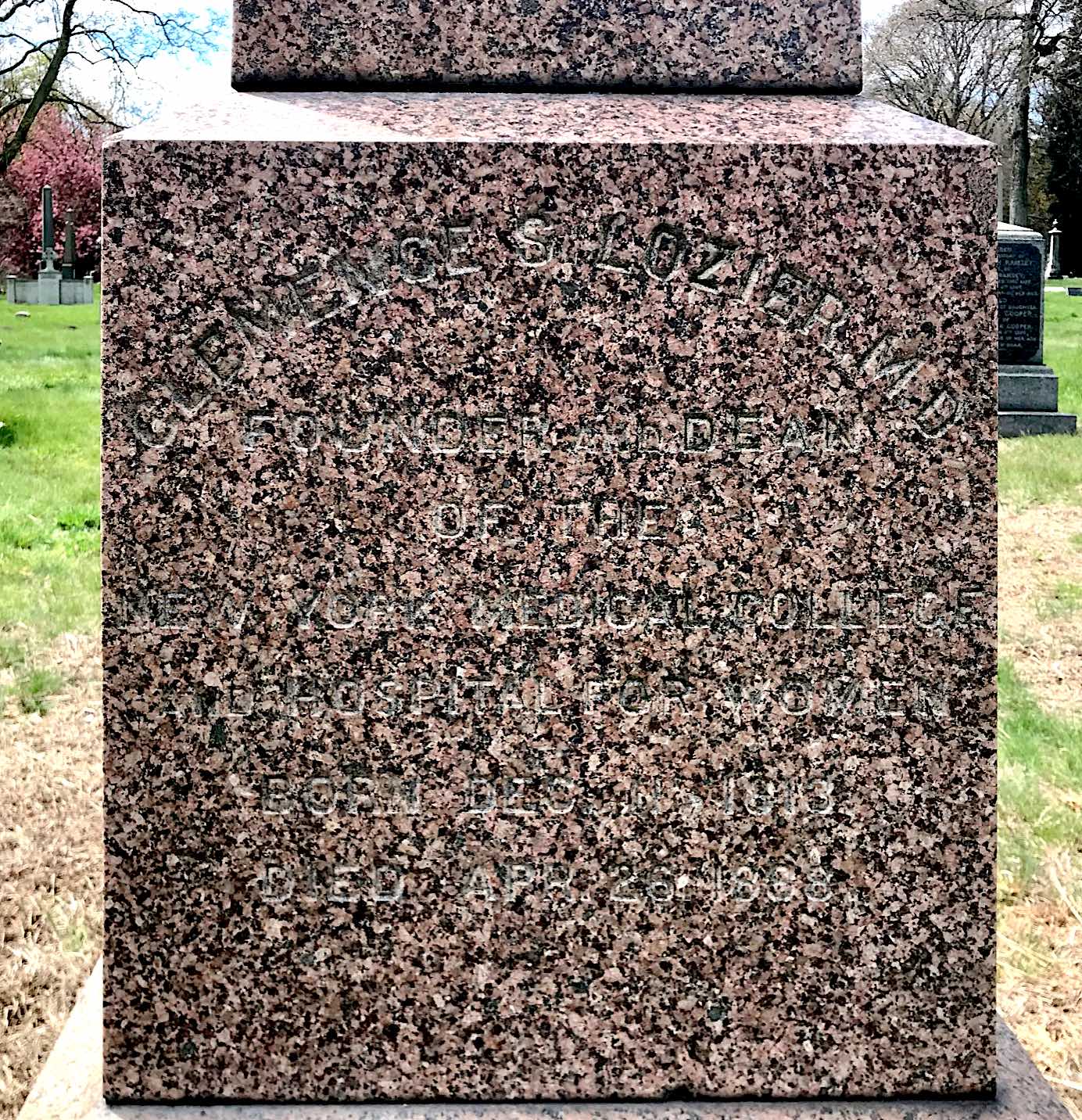 Implicit in being a medical doctor is helping others. In 1863, Dr. Clemence Lozier (1813-1888) (section 152, lot 19173) founded the first medical school in New York State to train women as doctors.