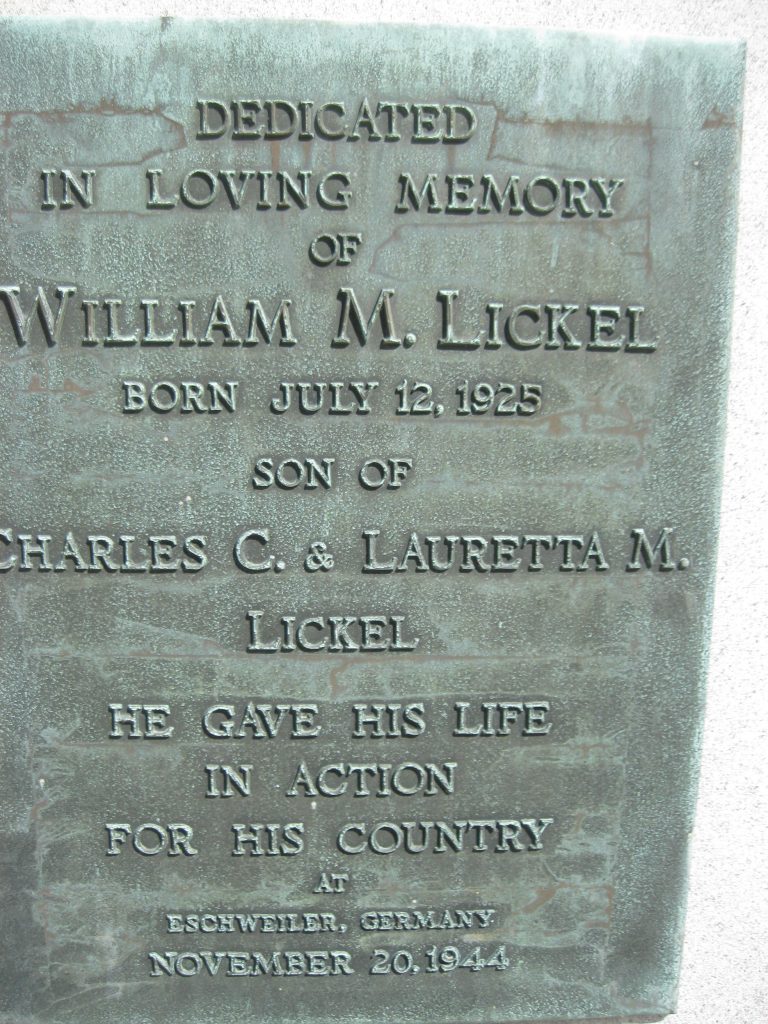 Although there are no official World War II papers documenting Lickel’s service history, his nephew relates that Lickel served in a tank corps unit under General George Patton, on the move from France through Belgium. As per his nephew, Lickel gave the ultimate sacrifice and died on November 20, 1944, in Eschweiler, Germany, at the age of nineteen. Given the date and location of his death, he may have taken part in the Battle of Hurtgen Forest. Hurtgen Forest, located at the border of Germany and Belgium, was to be used as a conduit for the Allies to advance into Germany. According to the Olive-Drab website: