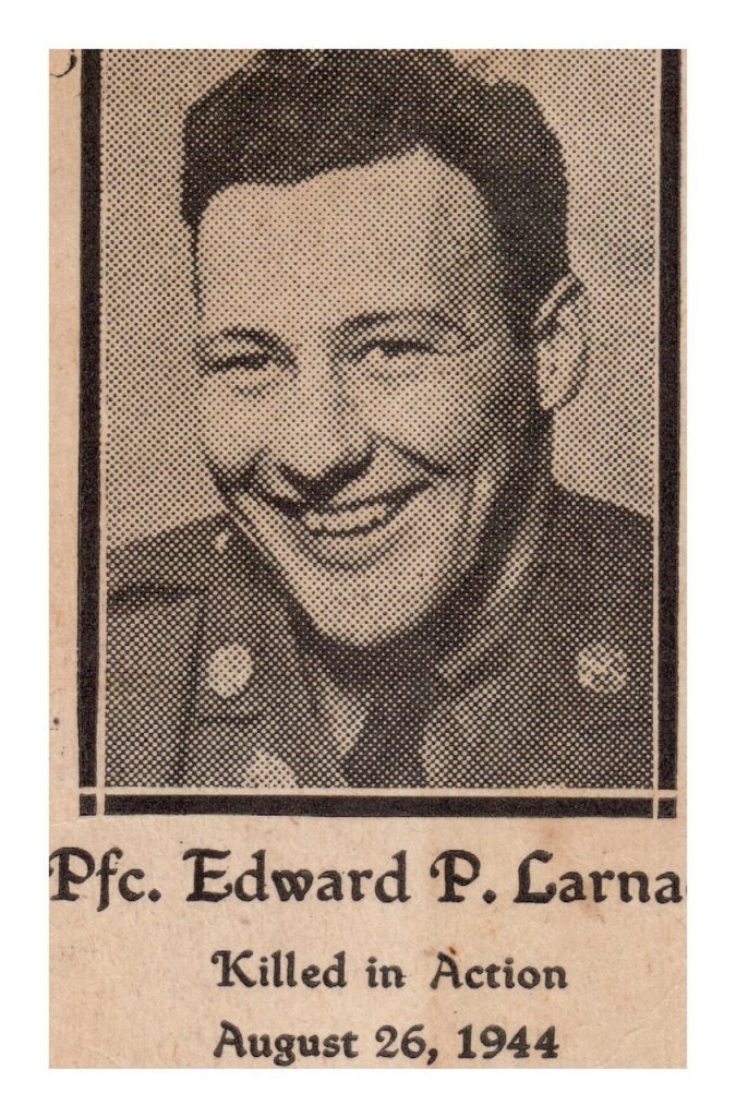 LARNED, JR., EDWARD PENNIMAN (1918-1944). Private first class, Coast Artillery Corps, United States Army. Larned was born in San Antonio, Texas. His father, Edward Sr. was an officer in the United States Army. His mother’s maiden name was Leslie Fuller. As per the 1920 federal census, the family lived in Summit City in Union County, New Jersey. The household consisted of Edward, his parents, two older sisters (Lesley and Katherine), and four servants: Julia Smith (nurse) from Ireland, Kate Hanlon (cook), also from Ireland, Harriet Kerswell (waitress) from England, and Rose Brady (nurse) from Ireland. As per Find A Grave, Larned’s father passed away in 1927 in Miami, Florida, and is buried in Green-Wood Cemetery.