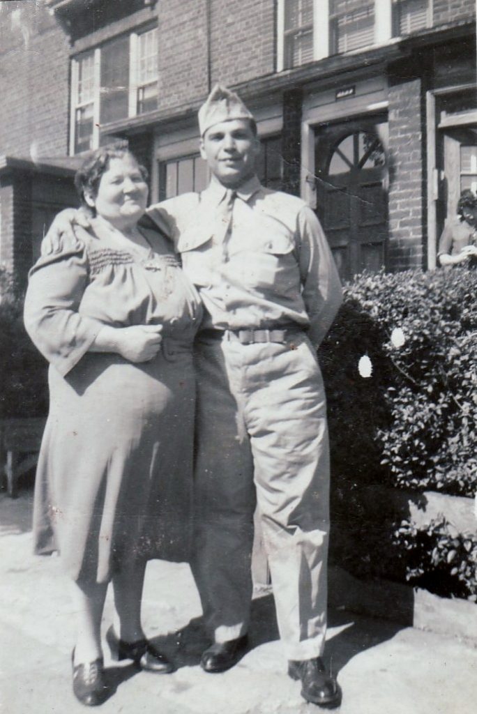 PESCE, CARMINE (1916-1989). Corporal, 147th Battalion, Company A, United States Army. Pesce was born in Brooklyn. His first name is documented as Carmino in birth records. According to his granddaughter, Michele Meehan, Pesce attended Public School 10 at 17th Street and 7th Avenue in Brooklyn. The 1925 New York State census documents that his parents, Francisco and Maria, and older brother, Edward, were born in Italy. The family lived on 17th Street in Brooklyn and Carmine was the fourth of eight siblings. As per the 1930 federal census, the Pesce family lived at 442 17th Street. His father was a plasterer. The family had grown to nine children, ranging in ages from two to twenty years old. Pesces’s parents, all their children and two cousins were living in the 17th Street residence. Pesce’s granddaughter shares that Carmine married Michelina Mignone on September 3, 1939, at Our Lady Queen of Peace Church in Brooklyn. The couple’s first daughter, Frances, was born on December 19, 1942.