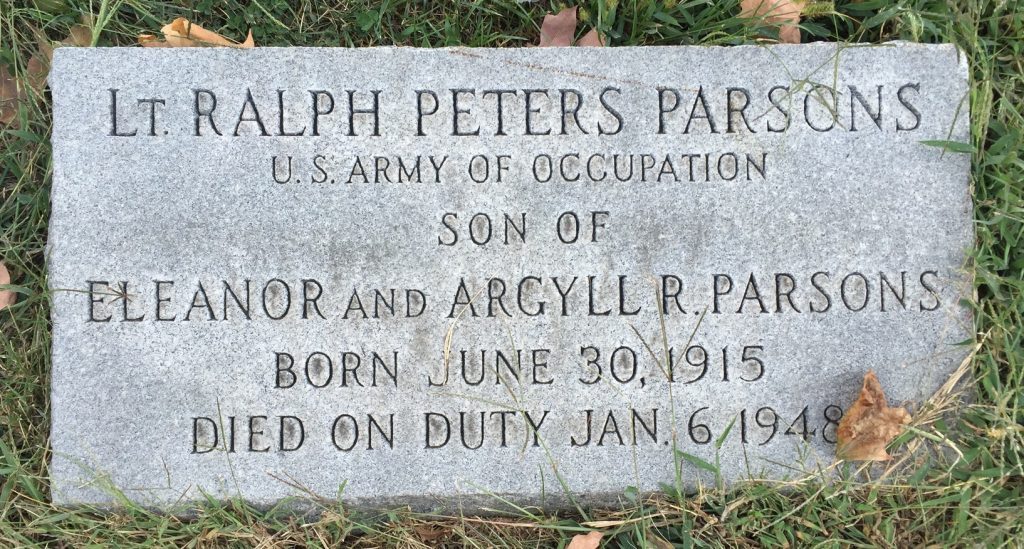 Ralph rose to the rank of lieutenant and was serving in Germany with the occupation forces when he was killed in a plane crash on January 6, 1948. The Parsons family saw all the men of that generation—four sons and one son-in-law—in military service during and after the war. Two sons died in the line of duty.