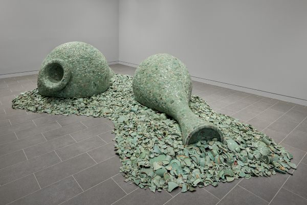 Two large vessels lie on their sides, built from thousands of celadon shards. In Celadon Landscape, Jean Shin begins with what was left behind. The work took shape during her visits to ceramic studios in Korea, where pieces discarded for minor flaws accumulated at the back of workshops.